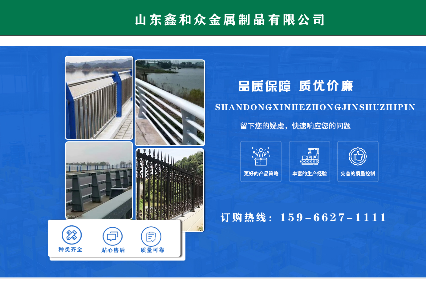 山東鑫和眾金屬制品有限公司主要產(chǎn)品有防撞護欄,橋梁護欄,道路護欄,河道護欄,不銹鋼護欄等護欄。提供設(shè)計方案,一站式定制,包您滿意價格優(yōu)惠,歡迎來電咨詢! 公司常年從事銷售護欄防撞護欄,橋梁護欄,道路護欄,河道護欄,不銹鋼護欄,橋梁鋼護欄,河道燈光護欄等。產(chǎn)品廣泛應(yīng)用于橋梁、河道、旅游景區(qū)、道路、公路、公園、小區(qū)、景觀、道路防撞等領(lǐng)域。 公司產(chǎn)品均采用優(yōu)質(zhì)不銹鋼材料,符合相關(guān)標(biāo)準。各種型號不銹鋼復(fù)合管及護欄,質(zhì)量嚴格把控。產(chǎn)品強度高、耐腐蝕、焊接牢固、抗沖擊、性能好,防撞護欄結(jié)構(gòu)簡單、美觀實用大方。 歡迎前來訂購!...